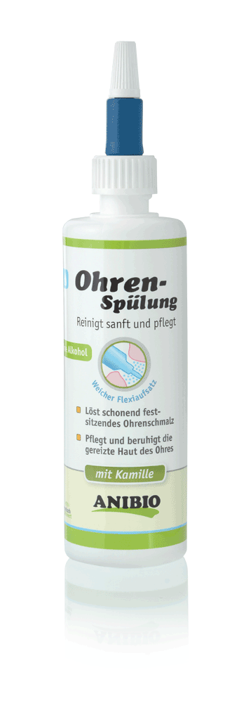 Es wird empfohlen, die Flüssigkeit vor der Anwendung auf Körpertemperatur zu erwärmen. 1-2 x täglich die weiche Spitze vorsichtig in das Ohr führen und die ANIBIO Ohren-Spülung durch leichten Druck auf die Flasche in den Gehörgang geben. Anschließend den Ohransatz von außen massieren. Jetzt sollte man rasch zur Seite treten, da das Tier sich schütteln wird und hierbei den größten Teil der gelösten Verunreinigungen sowie restliche Flüssigkeit herausschüttelt. Eine anschliessende manuelle Reinigung der Ohrmuschel und des äußeren Gehörganges darf nur mit äußerster Vorsicht vorgenommen werden (z.B. mit Wattebausch oder Gaze).