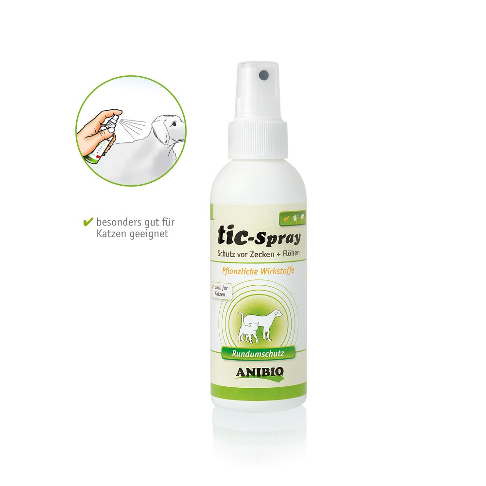 ANIBIO tic-Spray bietet dem Tier einen zuverlässigen Schutz vor Lästlingen aller Art (mind. 3 Tage). ANIBIO tic-Spray ist eine wässrige Lösung (ohne Alkohol) mit einem pflanzlichen Wirkstoff. Es pflegt zudem Haut und Fell, einfach anzuwenden und leicht zu verteilen.