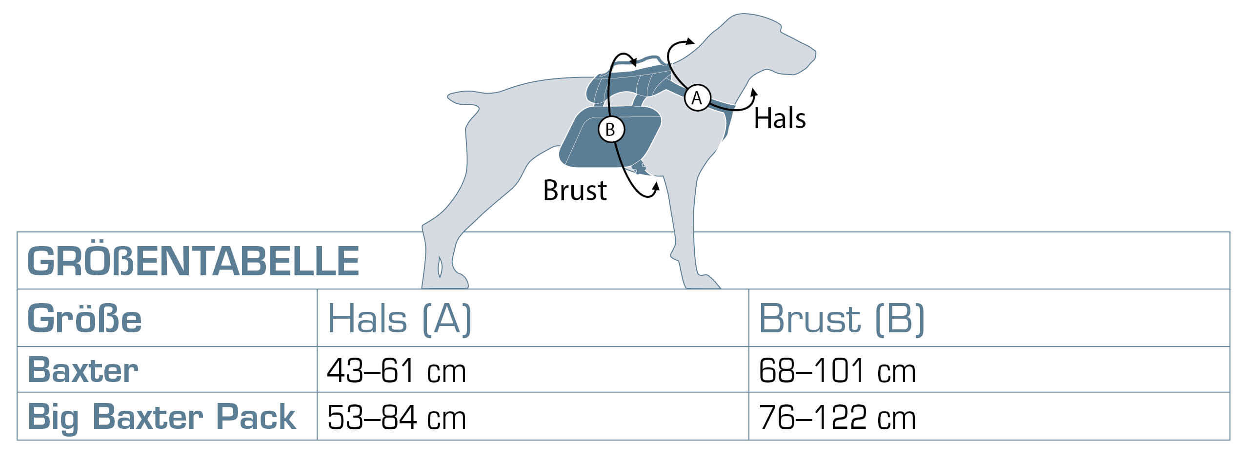 Wir empfehlen, dass Hunde im Rucksack nicht mehr als 25% ihres eigenen Gewichtes tragen. Wenn der Hund noch keine Erfahrung mit einem Hunderucksack hat, beginnen Sie mit einer geringen Last und erhöhen Sie diese schrittweise.