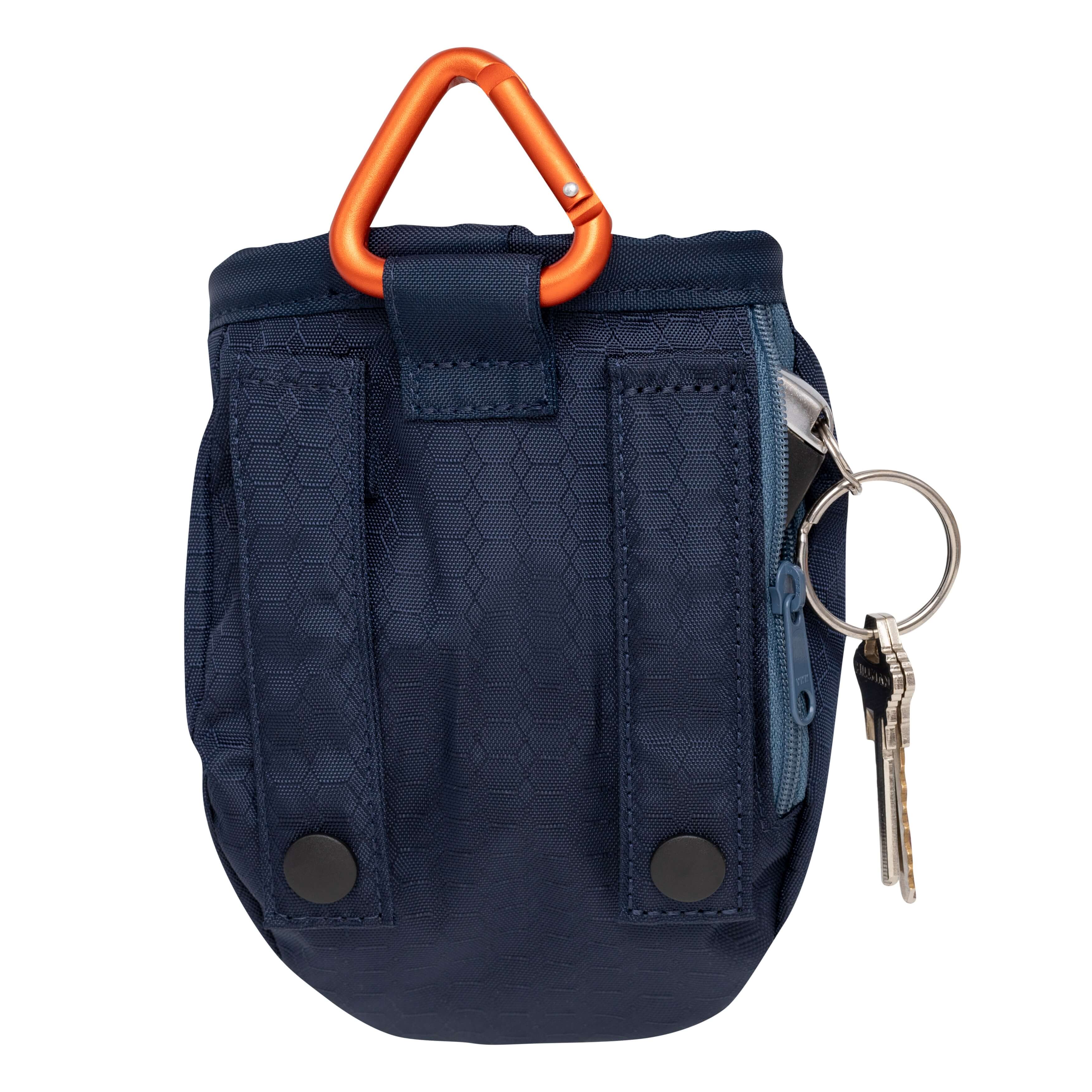 Wahlweise beinhaltet der Go Stuff It Treat Bag einen Karabiner und einen Befestigungsclip zum Befestigen an der Kleidung oder am Zubehör. Der Inhalt wird durch einen Kordelverschluss sich aufbewahrt.