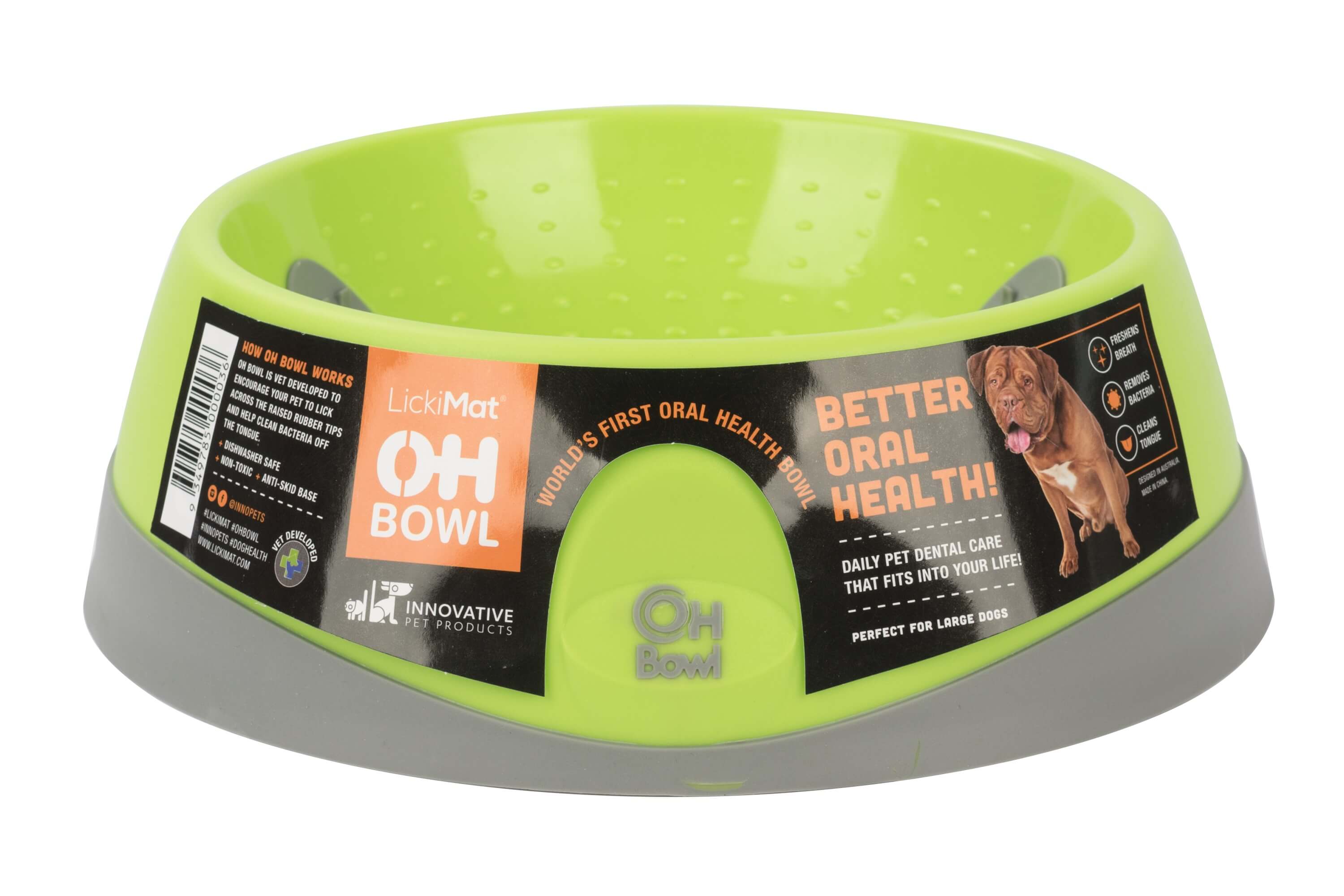Der LickiMat OH Bowl ist Fressnapf aus Kunststoff mit einem Zungenreinigungspad aus Gummi.