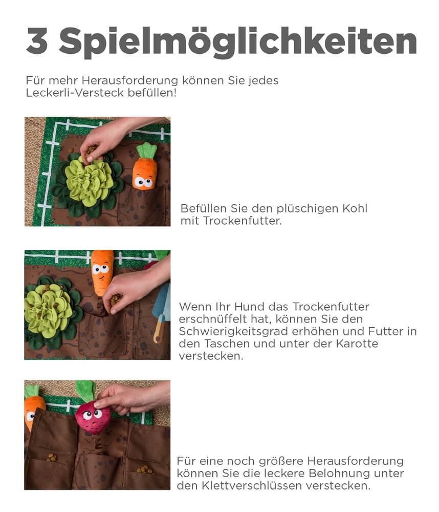 Wie man spielt: Füllen Sie die einzelnen Taschen mit Leckereien oder Knabbereien. Lassen Sie Ihren Hund riechen, um neugierig zu werden. Zeigen Sie Ihrem Hund, wie das Activity Matz Garden Game funktioniert, um die Belohnung herauszubekommen. Hunde sind schlauer als Sie denken. Manchmal müssen wir sie nur unterrichten!