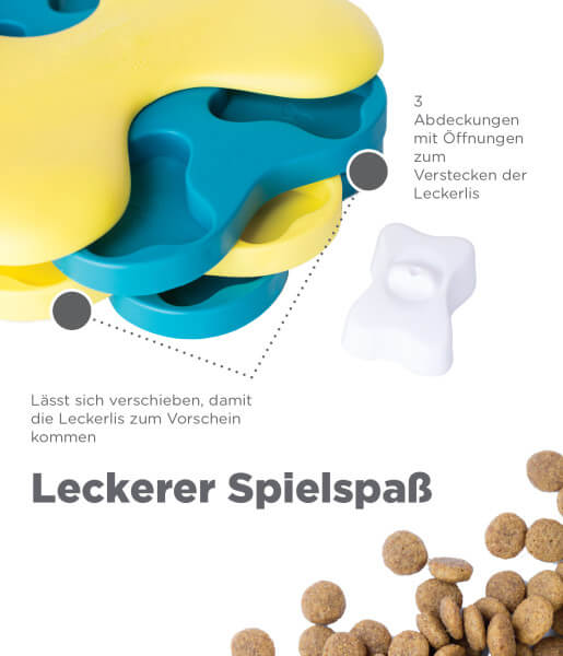 Wie man spielt: Legen Sie Leckereien oder Knabbereien in die Fächer der Spiels. Decken Sie einige Fächer mit Knochen ab. Je mehr Fächer abgedeckt sind, desto schwieriger wird das Spiel! Lasst die Spiele beginnen! Zeigen Sie Ihrem Hund, wie das Spiel funktioniert, und ermutigen Sie ihn, Leckereien zu finden. Hunde sind schlauer als Sie denken. Manchmal müssen wir sie nur unterrichten! Lassen Sie einige Fächer frei und zeigen Sie Ihrem Hund, wie er dreht.