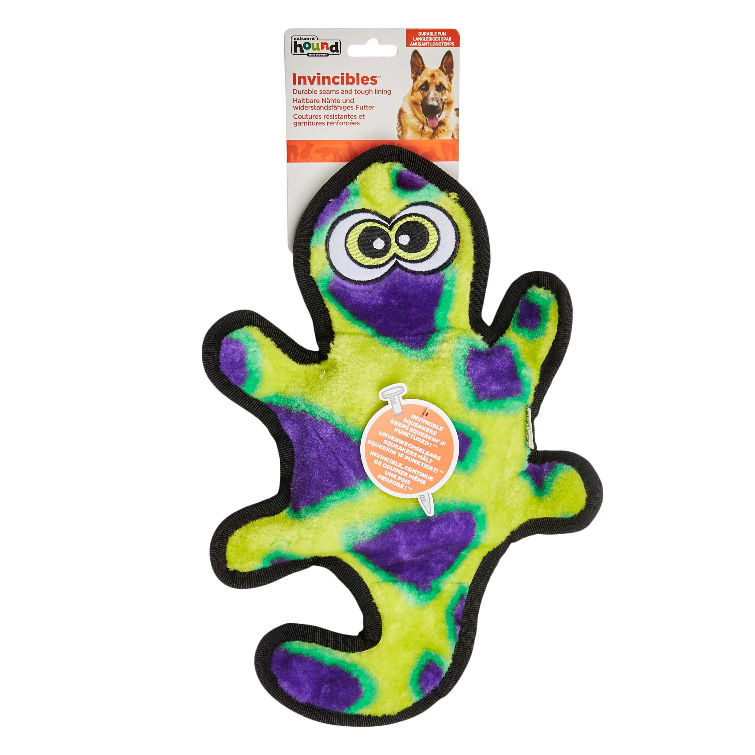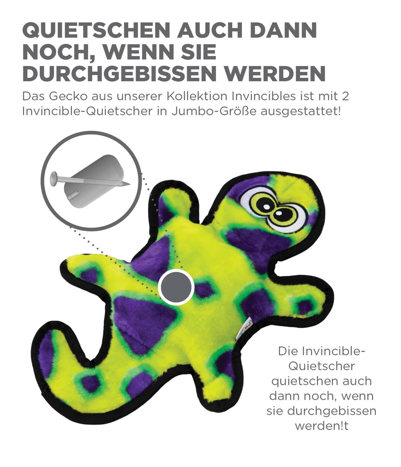 Die Invincibles Geckos sind in 2 verschiedenen Größen erhältlich, sodass Sie die richtige Passform für die Größe und das Aktivitätsniveau Ihres Hundes wählen können: Mittel (2 Quietscher) Groß (4 Quietscher)