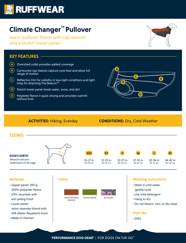Das Obermaterial des Climate Changer Pullover besteht aus weichem Fleece. Das Elasthan im unterem Bereich bietet eine gute Passform und somit eine gute Bewegungsfreiheit. Aus diesem Grund bietet der Climate Changer Pullover auch eine sehr gute Alternative für Hunde mit breiten Schultern, ausgeprägtem Brustkorb oder Nacken. Ein wichtiges Sicherheitsfeature stellen die seitlich reflektierenden Nähte dar. Eine Befestigungsschlaufe im Nackenbereich zur Anbringung externer Lichtquellen wie z.B The Beacon oder Audible Beacon von Ruffwear, runden dieses ab.