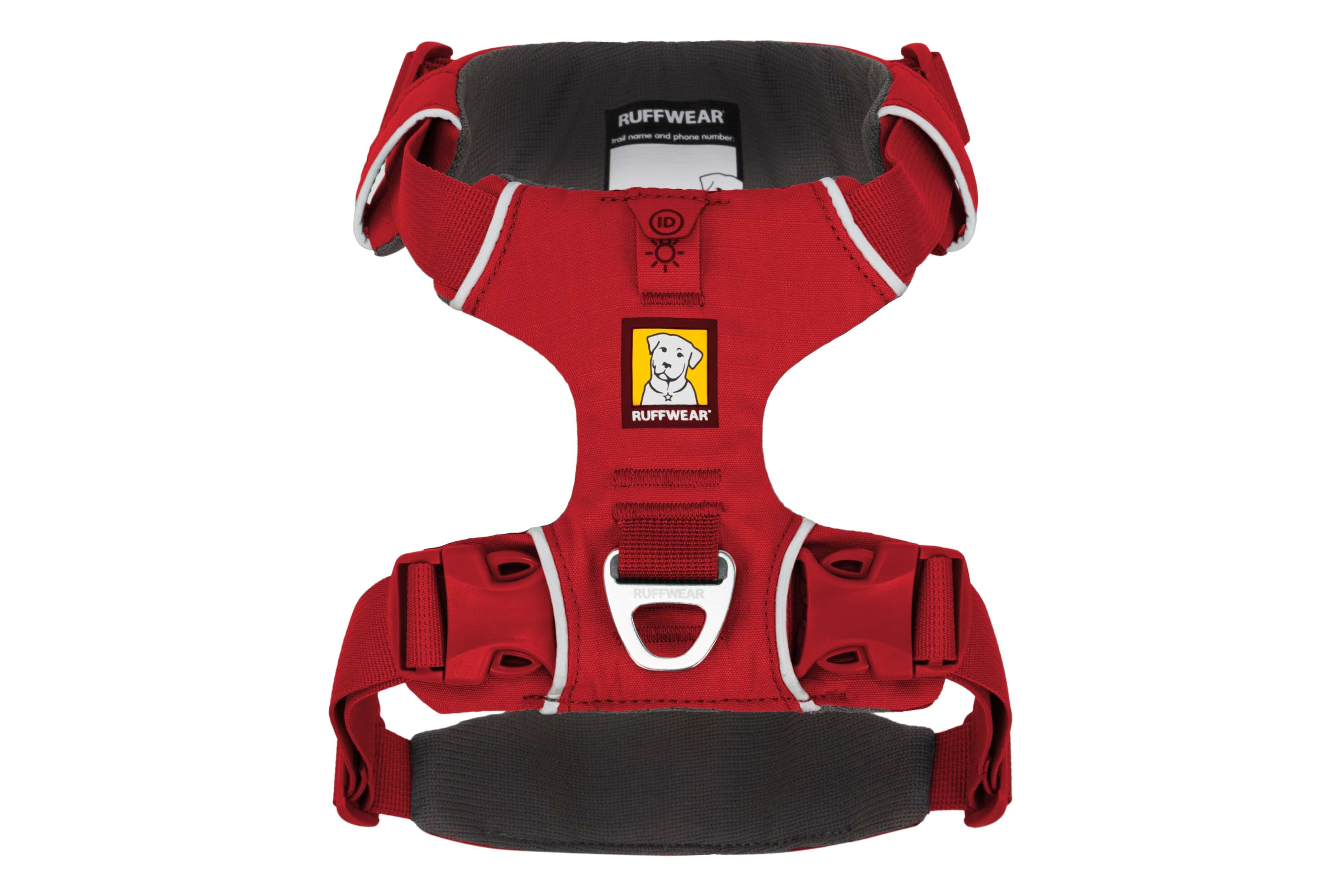 Gepolstertes Geschirr für die alltäglichen Abenteuer ist einfach anzulegen. Zwei Befestigungspunkte für die Leine: V-Ring auf dem Rücken des Hundes und verstärkte Gewebeschlaufe an der Brust für zusätzliche Kontrolle bei zweifachem Leinenanschluss.