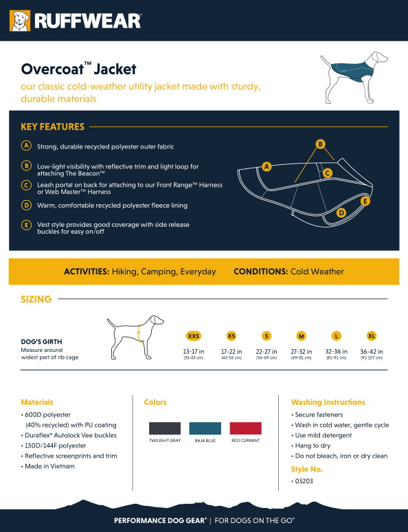 Der strapazierfähige Overcoat Utility Jacket ist im Inneren mit warmen Fleece gefüttert. Seitlich angebrachte, verstellbare Befestigungsschnallen garantieren ein problemloses und einfaches An- und Ausziehen. Ein wichtiges Sicherheitsfeature stellen die seitlich reflektierenden Nähte dar. Eine Befestigungsschlaufe im Nackenbereich zur Anbringung externer Lichtquellen wie z.B The Beacon oder Audible Beacon von Ruffwear, runden dieses ab.