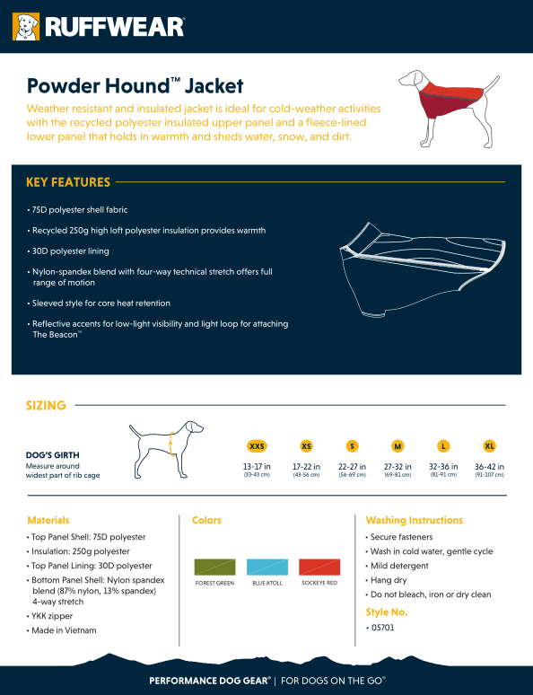 Das Obermaterial des Powder Hound besteht aus gefüttertem, recycltem Fleece. Das Elasthan im unterem Bereich des Powder Hound bietet eine optimale Passform und somit eine hervorragende Bewegungsfreiheit. Der seitlich angebrachte Reißverschluss ist ideal zum einfachen An- und Ausziehen. Die Ärmel an der Vorderseite des Powder Hound bieten eine maximale Abdeckung für die Wärmespeicherung und Bewegungsfreiheit des Hundes. Der Powder Hound wärmt den Hund rundherum und ist dabei atmungsaktiv. Ein wichtiges Sicherheitsfeature stellt die reflektierende Naht am hintern Teil des Powder Hound dar. Eine Befestigungsschlaufe im Nackenbereich zur Anbringung externer Lichtquellen wie z.B The Beacon oder Audible Beacon von Ruffwear, runden dieses ab.