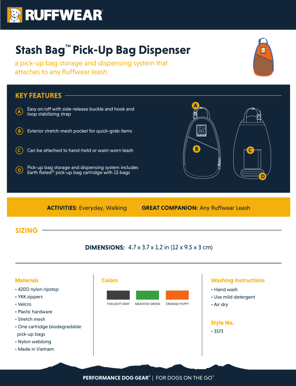 Die Stash Bag läßt sich leicht an jeder Ruffwear-Leine befestigen. Die leichte und benutzerfreundliche Stash Bag verfügt über einen beidseitigen Klickverschluss, ein internes Klettverschlussriemchen und ein Innenfach für Kleinigkeiten. Ein Aussenfach auf der Rückseite ermöglicht einen schnellen Zugriff auf die Kotbeutel. Er ist mit jeder Kotbeutelgröße kompatibel und wird mit 15 Earth Rated Kotbeutel geliefert.