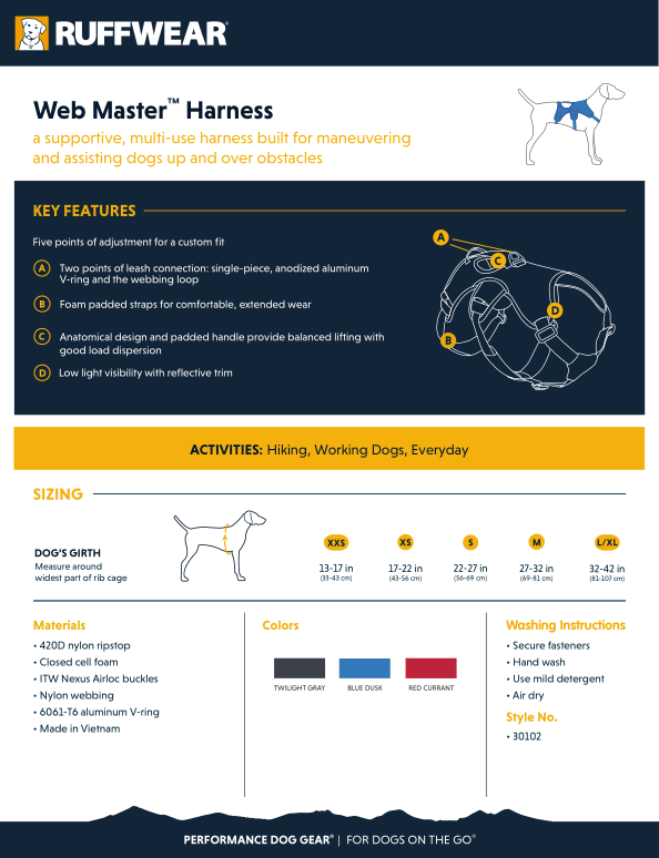 Das Web Master Harness wurde zum Manövrieren und Unterstützen von Hunden über Hindernisse sowie für ausgewiesene Arbeitshunde entwickelt. Dieses optimal gepolsterte Geschirr bietet sicheren Halt, ohne die Bewegungsfreiheit des Hundes zu beeinträchtigen. Fünf Einstellpunkte sorgen für einen sicheren Sitz, während die gepolsterten Brust- und Bauchgurte des Web Master Harness ein Anheben oder Tragen des Hundes angenehm machen. Das Web Master Harness ist das bevorzugte Geschirr für viele Rettungshunde, Diensthunde,Trailhunde, etc. Es eignet sich aber auch sehr gut für Angsthunde, da es absolut ausbruchsicher ist. Auch Hunde mit Knochen- oder Gelenkproblemen bietet das Web Master Harness eine entlastende Hilfe für die Mobilität. Ein wichtiges Sicherheitsfeature stellen die reflektierenden, seitlichen Nähte am Web Master Harness dar. Eine Befestigungsschlaufe im Nackenbereich zur Anbringung externer Lichtquellen wie z.B The Beacon oder Audible Beacon von Ruffwear, runden dieses ab.