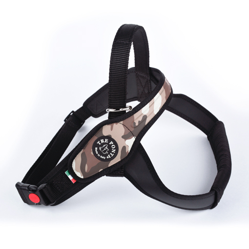 Der gepolsterte Brustgurt des PRIMO CAMOUFLAGE verringert den Druck auf die Brust des Hundes, wenn er zum Ziehen neigt. Der hintere Griff bietet eine höhere Sicherheit in potenziell gefährlichen Situationen, um den Hund eng bei sich zu halten. Der flexible O-Ring am Griff erleichtert das Gleiten der Leine von der einen zur anderen Seite. Der verstellbare Bauchgurt lässt sich optimal für verschiedene Brustumfänge einstellen. Der Click-Verschluss ist durch einen zusätzlichen Sperrknopf gesichert.